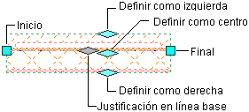 Aparecen seis pinzamientos, y cuatro de ellos indican las opciones de justificación: Izquierda, Derecha, Centro y Línea base. El pinzamiento gris indica la justificación actual. También se muestran los pinzamientos inicial y final del segmento de muro.