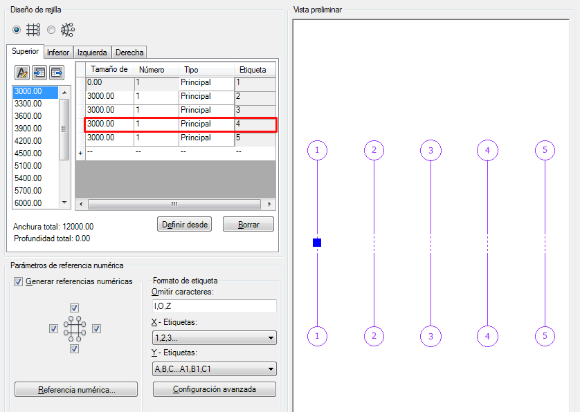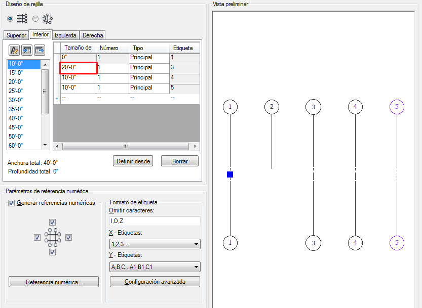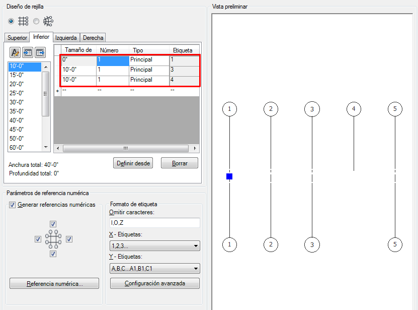 De este modo, el primer hueco se extiende dos huecos hacia la parte inferior, obteniendo cuatro líneas de rejilla, en lugar de cinco. Ahora puede pasar a la ficha Izquierda para editar el otro eje de la rejilla o bien pulsar Intro para colocar la rejilla en el dibujo.