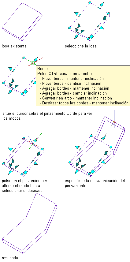 Mediante el procedimiento general siguiente, seleccione un modo de pinzamiento de borde y modifique el borde de una losa o losa para cubierta: