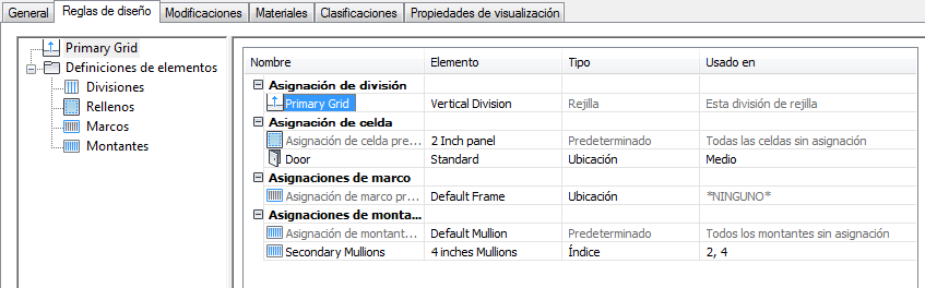 Puede modificar las definiciones de elementos en la ficha Reglas de diseño del cuadro de diálogo Propiedades de conjunto de puerta y ventana. Puede acceder a estas definiciones desde la lista de asignaciones y desde la lista de definiciones: