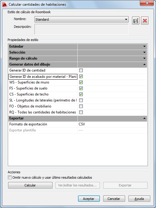 - En el cuadro de diálogo Calcular cantidades de habitaciones, en Propiedades de estilo, lista Generar datos del dibujo, seleccione Generar ID de acabado por material.