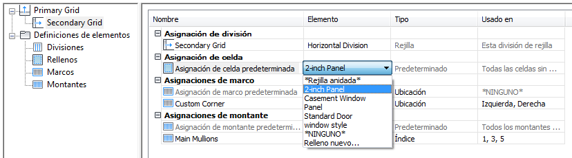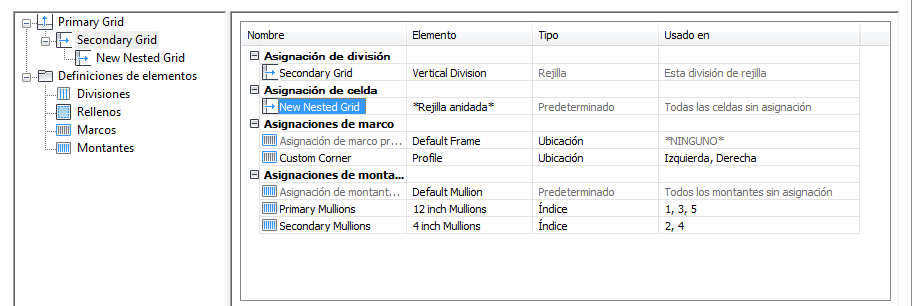 Se agrega una rejilla nueva a la lista de rejillas del panel izquierdo del cuadro de diálogo. Si está editando la rejilla principal, la nueva rejilla se agrega al nivel secundario. Si está editando una rejilla de nivel secundario, la rejilla adicional se incluye en el nivel terciario, y así sucesivamente.