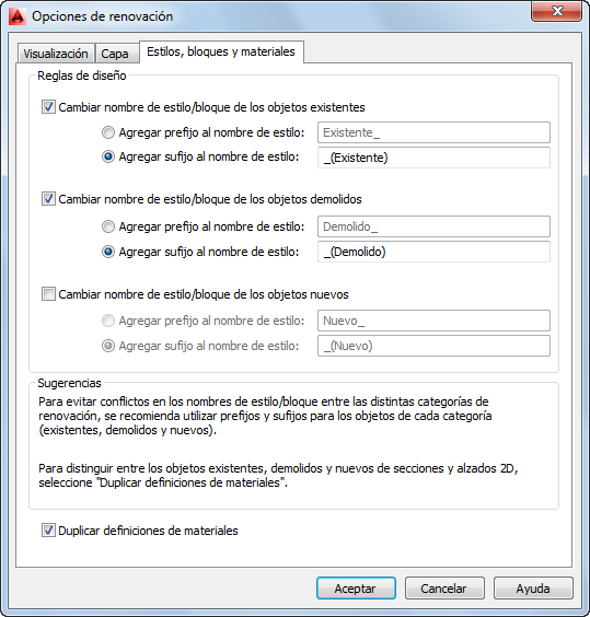 Modifique las reglas de diseño de renovación para añadir automáticamente un prefijo o sufijo a los nombres de estilo y bloque basándose en su categoría de renovación. Si no define previamente un prefijo o un sufijo y ya existe el mismo nombre de bloque o estilo en otra categoría del dibujo, se mostrará un mensaje de alerta y podrá escribir un nuevo nombre manualmente.