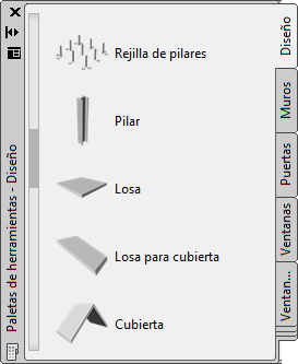 La paleta de herramientas Diseño contiene una herramienta de losa y losa para cubierta de muestra que puede utilizarse y personalizarse según sea necesario. Las paletas personalizadas creadas por el administrador de CAD o por otros usuarios también pueden contener herramientas de losa o losa para cubierta con estilos y propiedades personalizados según las normas de una empresa o proyecto.