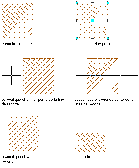 Atención: Si va recortar dividir un espacio con desfases de contornos manuales, verifique que estén activos todos los contornos. Los contornos que no estén activos no se recortarán.