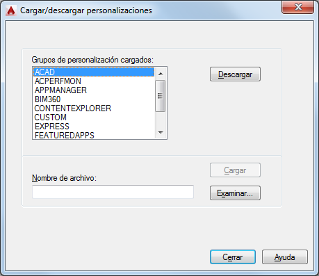 Permite especificar el archivo que se carga al elegir Cargar. Puede escribir el nombre de archivo o hacer clic en Examinar para mostrar el cuadro de diálogo Seleccionar archivo de personalización (un cuadro de diálogo de selección de archivos estándar).