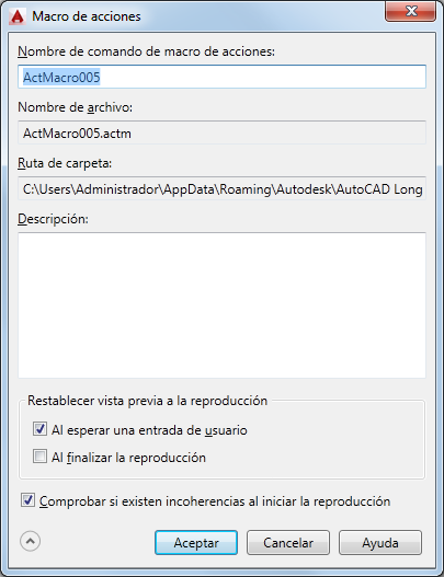 Puede guardar o cambiar el nombre de la macro de acciones actual y definir su comportamiento de reproducción. Se puede suprimir la visualización de este cuadro de diálogo. Para ello, desactive el parámetro Solicitar nombre de macro de acciones en el cuadro de diálogo Preferencias de la grabadora de acciones.
