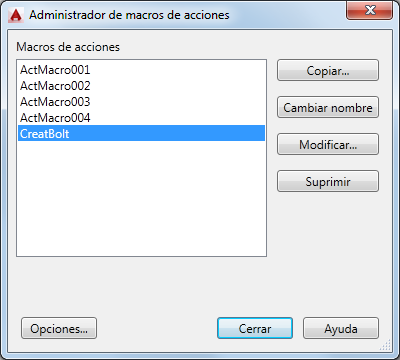Los archivos de macros de acciones que se hayan grabado (ACTM) aparecerán listados en el Administrador de macros de acciones.