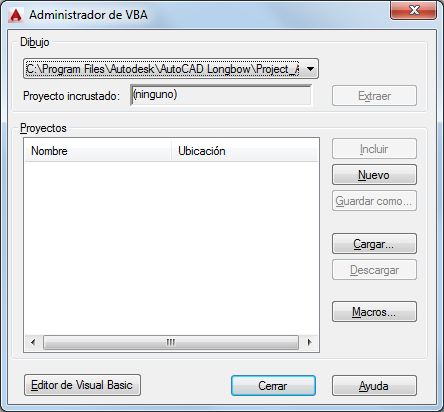 Muestra el Editor de Visual Basic en el que se puede editar códigos, formularios y referencias para cualquier proyecto VBA global cargado o incrustado en un dibujo abierto. También se pueden depurar y ejecutar proyectos desde el Editor de Visual Basic.