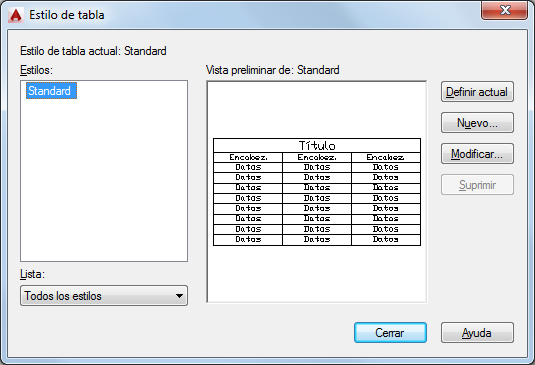Suprime el estilo de tabla seleccionado en la lista Estilos. Los estilos que se están utilizando en el dibujo no se pueden suprimir.