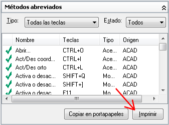 - En el panel Métodos abreviados, filtre el tipo y estado de los métodos abreviados del teclado para imprimir.