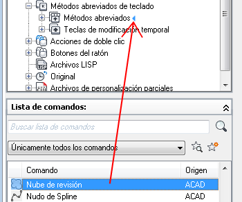 - Para crear un método abreviado, vaya al panel Lista de comandos y arrastre un comando al nodo Métodos abreviados del panel Personalizaciones en <nombre de archivo>.