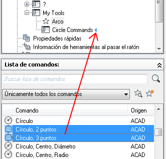 En el panel Lista de comandos, arrastre el comando que desea añadir al submenú en el panel Personalizaciones en <nombre de archivo>.