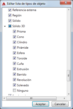 Cuando un tipo de objeto está activado, al colocar el cursor sobre un objeto del mismo tipo las propiedades correspondientes a ese tipo de objeto se muestran en una información de herramientas al pasar el ratón. Desactive la marca de verificación adyacente al tipo de objeto para desactivar la información de herramientas al pasar el ratón de ese tipo de objeto.