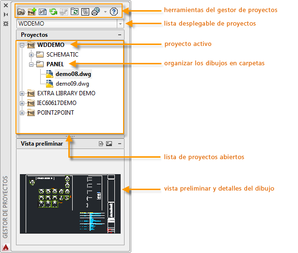 Gestor de proyectos es una paleta que puede permanecer en pantalla incluso mientras se utilizan otros comandos. Se puede acoplar, cambiar de tamaño y ocultar automáticamente.