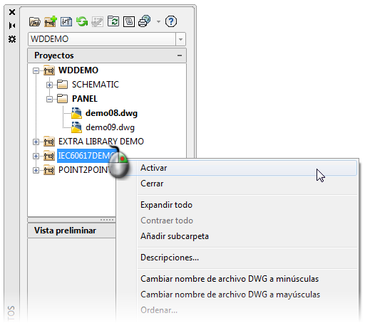 Se pueden tener tantos proyectos abiertos en el Gestor de proyectos como sea necesario, pero solo puede haber un proyecto activo a la vez. Las funciones de todo el proyecto solo procesan los dibujos del proyecto activo.