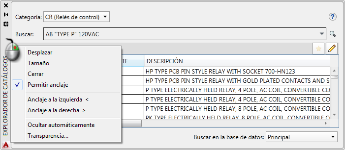 AutoCAD Electrical utiliza paletas para administrar los proyectos y para trabajar con la base de datos de catálogo. Una paleta puede permanecer en la pantalla mientras se utilizan otros comandos. De este modo, está accesible siempre que la necesita.