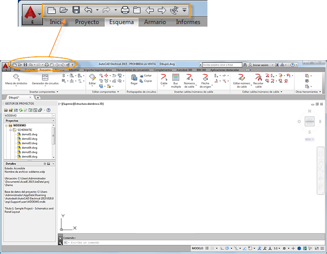 Puede acceder a todas las funciones que se muestran en esta guía desde la cinta de opciones. Además, la barra de herramientas de acceso rápido que se muestra incluye algunos comandos de navegación utilizados en AutoCAD Electrical.