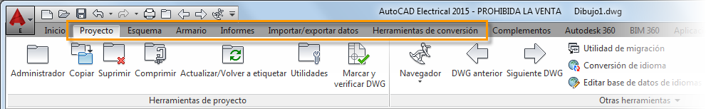AutoCAD Electrical incluye una cinta de opciones estándar con fichas en la parte superior del área de dibujo. Las fichas específicas de AutoCAD Electrical se incluyen junto con las fichas de la cinta de opciones de AutoCAD.