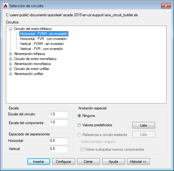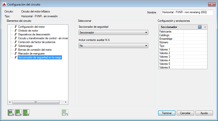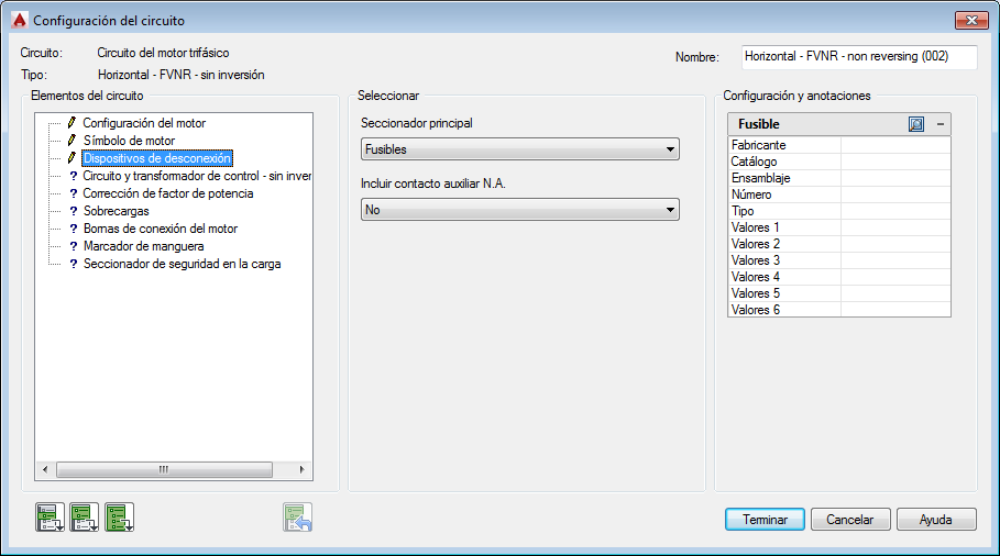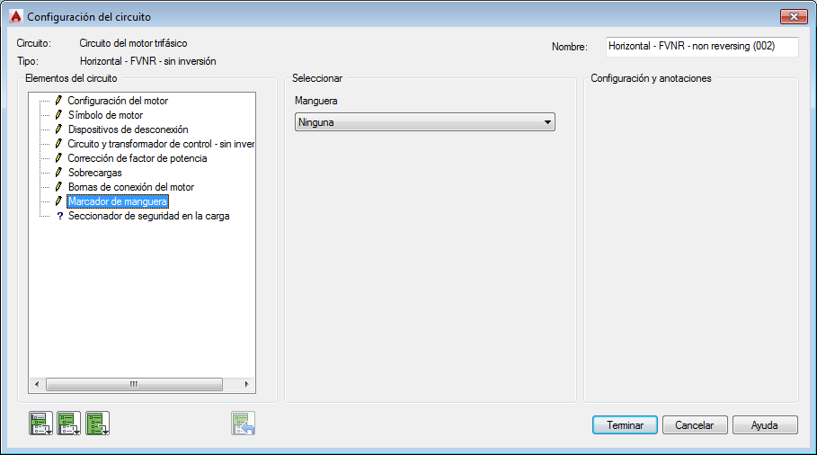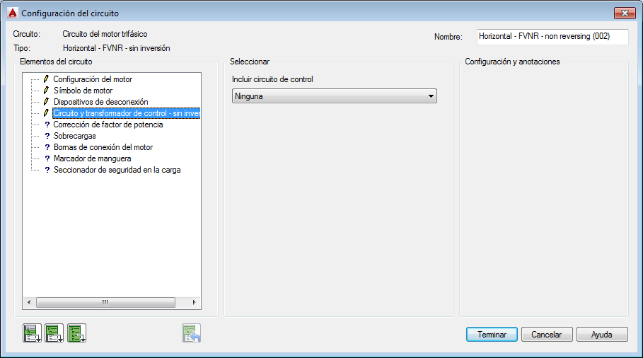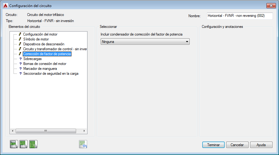 Sección Configuración y anotaciones: las opciones de esta sección cambiarán en función de las selecciones que haya realizado en las secciones Elementos del circuito y Seleccionar. Escriba valores o seleccione el botón Examinar para acceder a la tabla de consulta.