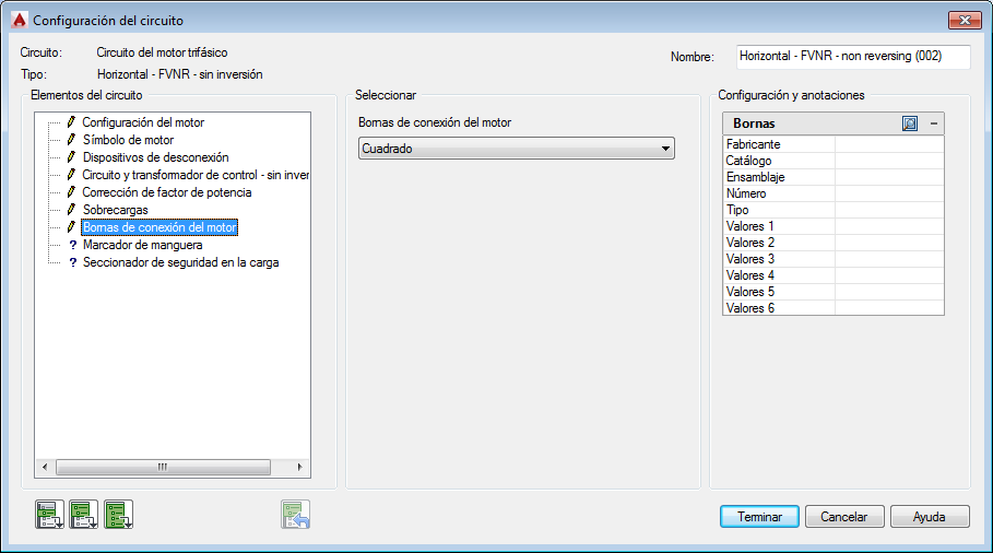 En la sección Seleccionar, elija Bornas de conexión del motor: Redondo.