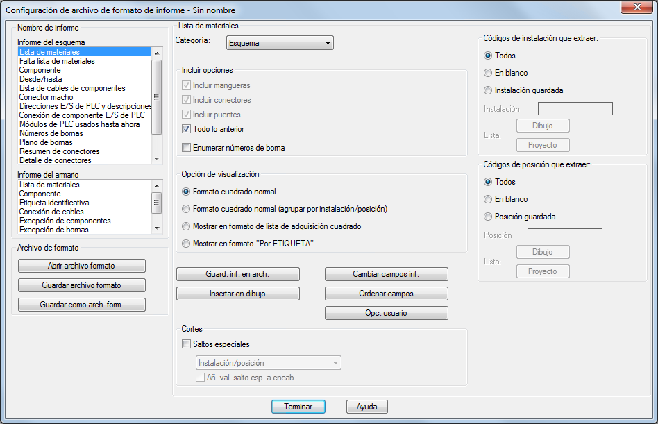 Utilice este cuadro de diálogo para predefinir las opciones del informe, la configuración de los campos, la configuración de las tablas del informe, los parámetros del archivo de salida, etc. Las opciones del informe pueden ser diferentes en función del tipo de informe seleccionado.