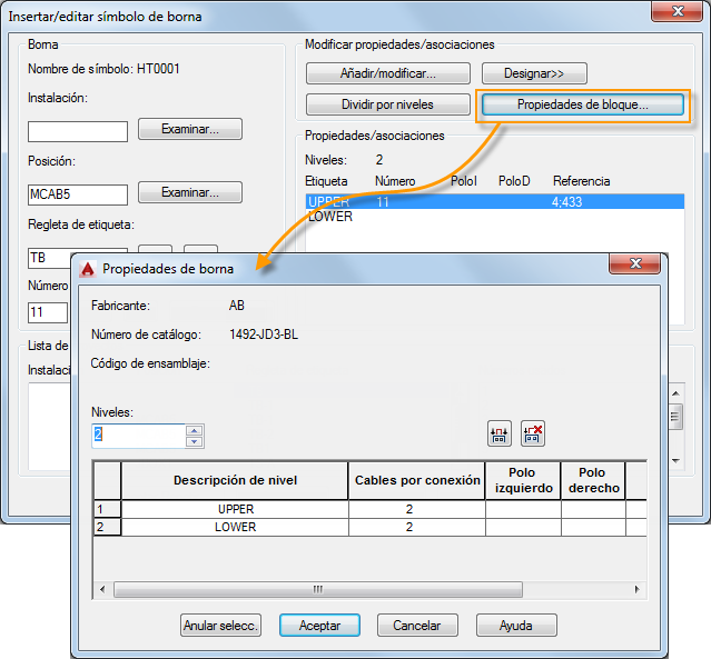 Un símbolo de borna del esquema puede representar una borna de un solo nivel o un nivel de una borna de varios niveles. El número de niveles de la borna se define como una propiedad de bloque. Cada nivel tiene ciertas características, como por ejemplo una etiqueta, cables por conexión, un polo izquierdo y un polo derecho. Cada símbolo de borna del esquema contiene todas las propiedades del bloque para todos los niveles, de modo que si se elimina un símbolo de borna no se eliminan las propiedades de bloque. Si se modifica una propiedad de bloque, se actualizan todos los símbolos de borna. Un símbolo sin ninguna propiedad de nivel se trata como una borna de un solo nivel. Las propiedades de borna pueden ser parte de una asignación de catálogo y aplicarse automáticamente al asignar el catálogo.