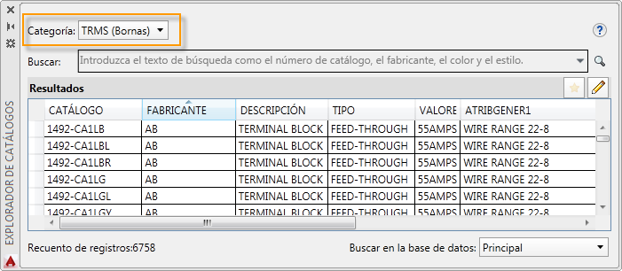 Inserte bornas del mismo modo que otros símbolos esquemáticos, desde el Explorador de catálogos o el menú de símbolos. Si realiza la inserción desde el Explorador de catálogos, seleccione la categoría TRMS (bornas).