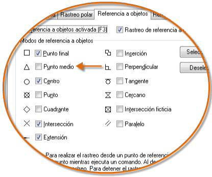 Escriba el comando REFENT para definir la referencia a objetos por defecto, que también se denomina referencia a objetos "en ejecución". Por ejemplo, puede resultar muy útil activar la referencia a objetos de punto medio por defecto.