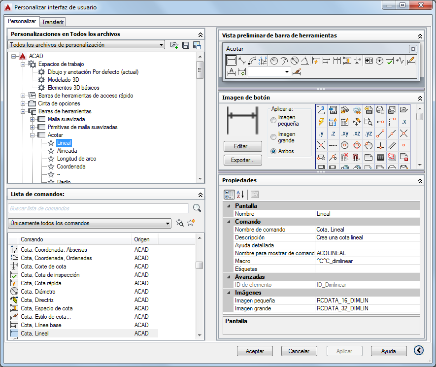 - Imagen grande: precisa el archivo de imágenes grandes que se va a utilizar cuando se añada un comando a una barra de herramientas o un panel de cinta de opciones.