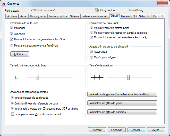 Permite establecer opciones de varias funciones de edición, incluidas AutoSnap y AutoTrack.