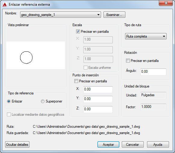 Muestra la ruta que se guarda con el dibujo al enlazar la referencia externa. La ruta depende del parámetro Tipo de ruta.