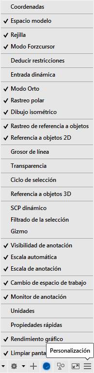 Nota: La función Visualización de coordenadas no se muestra por defecto en la barra de estado. Para mostrar las coordenadas en la barra de estado, seleccione Coordenadas en el botón Personalización de la barra de estado.