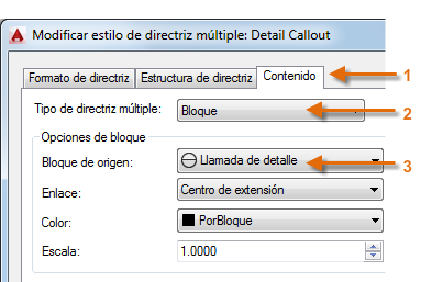 Por ejemplo, para crear un estilo de tipo "llamada de detalle", inicie el comando ESTILDIRECTRIZM. En el Administrador de estilos de directriz múltiple, haga clic en Nuevo y elija un nombre descriptivo para el nuevo estilo de directriz múltiple. Haga clic en la ficha Contenido, seleccione Bloque y, a continuación, Llamada de detalle, como se muestra.