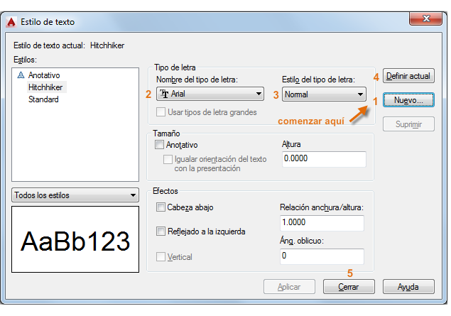 Al crear un estilo de texto nuevo, debe darle un nombre y, a continuación, seleccionar un tipo de letra y su estilo. El orden en el que se debe hacer clic en los botones se muestra a continuación: