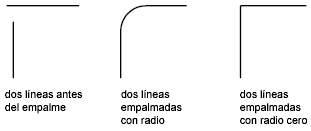 Se denomina radio de un empalme al radio del arco que conecta los objetos empalmados. La modificación del radio de empalme afecta a otros empalmes creados posteriormente. Si establece el radio del empalme en 0, los objetos empalmados se recortarán o alargarán hasta que se crucen, pero no se crearán arcos.