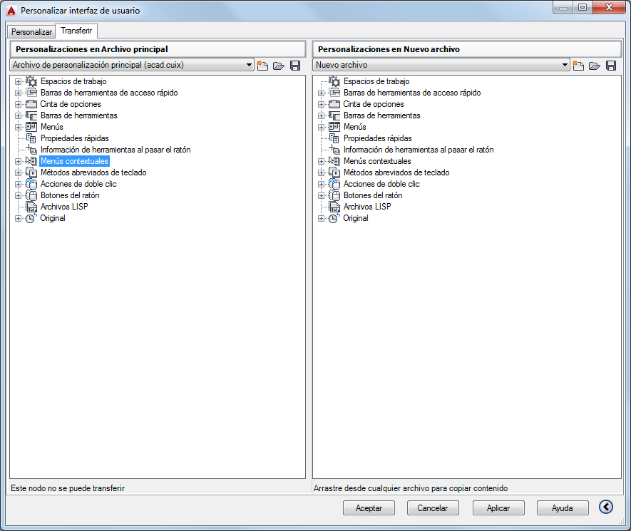 Cuando se escribe IMPORTARIUP en la solicitud de comando, el archivo CUIx principal se muestra en el panel de la derecha (por defecto, acad.cuix para los archivos de AutoCAD o acadlt.cuix para los archivos de AutoCAD LT). Es necesario abrir el archivo CUIx o el archivo de personalización original en el panel izquierdo para transferir los datos. Cuando se escribe EXPORTARIUP en la solicitud de comando, el archivo CUIx principal aparece en el panel izquierdo. Es necesario abrir otro archivo CUIx u otro archivo de personalización original en el panel derecho para transferir los datos.