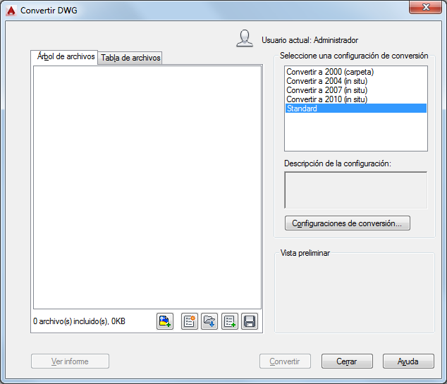 Muestra una lista de los archivos de dibujo que se desea convertir. Todos los archivos que se van a convertir se indican con una marca de verificación situada junto al nombre de archivo. Haga clic con el botón derecho en el área de visualización de archivos para abrir un menú contextual con diversas opciones.