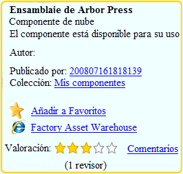 Los usuarios pueden optar por compartir sus componentes basados en nube con otros usuarios al publicarlos. Si un componente se puede compartir, otros usuarios pueden valorarlo o comentarlo. Las valoraciones y los comentarios de componentes se pueden ver en el explorador de componentes y en la página de información de componentes del Almacén de componentes de Factory basado en web.