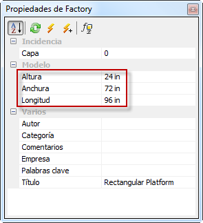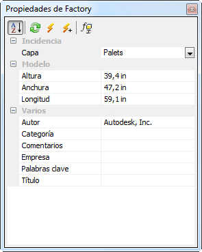 Después de colocar un componente del explorador de componentes, puede seleccionarlo y modificar los parámetros de Modelo o los parámetros de Varios en el explorador de propiedades de Factory. El explorador de propiedades de Factory se muestra automáticamente cuando se crea un nuevo layout. Para activar y desactivar el explorador de propiedades de Factory, haga clic en