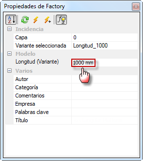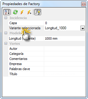 en la parte superior del explorador de propiedades de Factory para activar el nombre de la variante de parámetro del modelo.