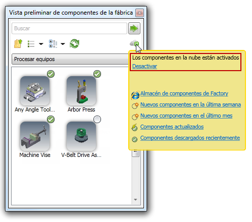 El contenido basado en nube debe activarse para poder descargar componentes basados en nube. Por lo general, el contenido basado en nube está activado por defecto y este icono aparece cerca de la parte superior derecha del explorador de componentes