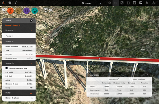 El panel Cantidades permite a los usuarios revisar los materiales de hormigón y acero necesarios para construir un puente seleccionado.
