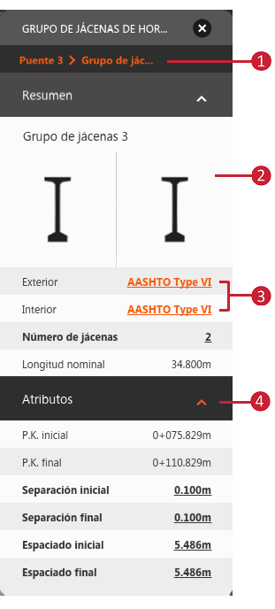 - Modifique directamente la separación, el espacio y el número de jácenas en el modo de edición. Los valores de P.K. inicial y final son de solo lectura en la tarjeta de recursos.