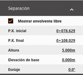 Nota: Para modificar la ubicación y el esviaje del envolvente, haga clic en los valores junto a P.K. inicial, P.K. final, Elevación de base o Esviaje. Especifique los valores deseados y pulse Intro.