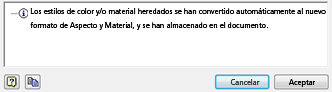 Los materiales se migran de estilos de material a materiales. No existe ninguna opción para aplazar esta acción. Los materiales personalizados que ha añadido se migran. Utilice el navegador de materiales y el editor de materiales para crear nuevos materiales o modificar los existentes.