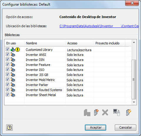 La ubicación por defecto del contenido de Desktop de Inventor es C:\ProgramData\Autodesk\Inventor <versión>\Content Center\Libraries o C:\Documents and Settings\All Users\Application Data\Autodesk\Inventor <versión>\Content Center\Libraries. Puede cambiar esta ubicación por defecto en las Opciones de la aplicación, ficha Centro de contenido. Observe la imagen anterior.