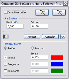 - Defina las propiedades del contacto 2D y visualice el vector de la fuerza. En el navegador, pulse con el botón derecho en la unión Contacto 2D y seleccione Propiedades.