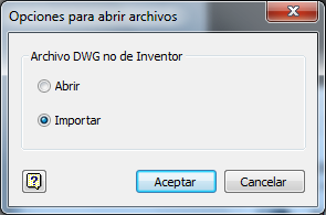 Pulse Abrir y seleccione el archivo adecuado. Si va a importar un archivo DWG, pulse Opciones. Seleccione la opción de Importar y pulse Aceptar.