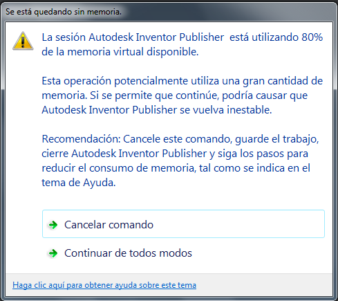 Cuando la memoria virtual utilizada supera el límite de 80%, las operaciones adicionales realizadas en el documento de Inventor Publisher muestran un cuadro de diálogo de advertencia que tiene la opción para cancelar o continuar con el comando. Los comandos como Insertar y Explosión automática pueden provocar que el uso de memoria virtual se acerque al 100% y en ese caso los resultados no serán predecibles.